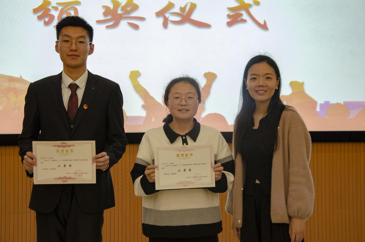 最后,由工作人员结合评委老师和大众评审团的评分计算各团支部的最终得分,并由席添添老师、涂新宇老师为优胜代表颁奖。最终经管2204团支部获得一等奖;经管2208团支部、会计2102团支部获得二等奖;工商2001团支部、工商2103团支部、金融2101团支部获得三等奖;经管2206团支部、经管2203团支部、信管T2101团支部、国贸2101团支部获得优秀奖。