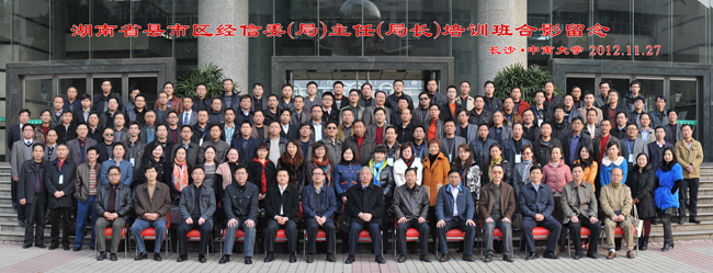 11月27日-12月1日,湖南省经信委联合买球的app排行榜前十名推荐十大正规买球的app排行榜在铁道校区国际报告厅举办了全省县市区经信委(局)主任(局长)培训班,培训班为期五天,全省共计160多名县市区经信委(局)主任(局长)参加了学习。第一天开班时湖南省经信委主任谢超英、副主任黄东红、十大正规买球的app排行榜常务副院长游达明教授以及省经信委多位领导与全体培训学员合影留念。