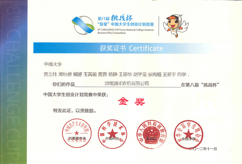 日前,在上海同济大学举行的第八届“挑战杯”中国大学生创业计划竞赛中,买球官网推送的“湖南润丰农机有限公司”创业团队斩获金奖,并成为湖南省今年参赛队伍中的唯一金奖团队。项目由我校常务副校长、十大正规买球的app排行榜院长黄健柏教授,买球的app排行榜前十名推荐体育教研部党委书记余文武和十大正规买球的app排行榜金融系饶育蕾教授共同担任项目指导老师,在学校和学院的大力支持下,该团队从升华杯特等奖到挑战杯湖南省金奖,再到挑战杯国家赛金奖,一路披荆斩棘,历时一年零四个月,终摘得省赛金奖、国赛金奖。近日,笔者有幸采访到该团队,探寻他们的坎坷创新创业之路。