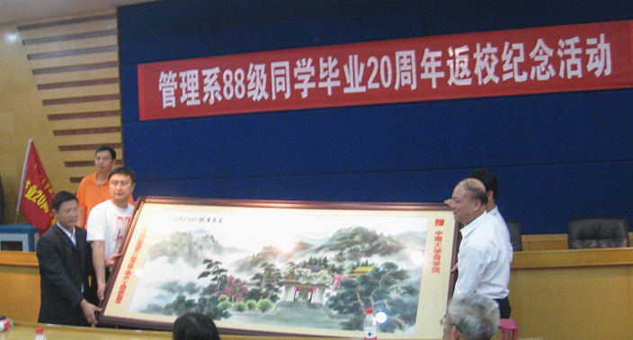 在座谈会上,多位领导与老师上台讲话,在座同学重温教授们的谆谆教诲。黄健柏教授在回顾建校历史的同时,也向校友们报告买球的app排行榜前十名推荐近年来取得的骄人成就;陈晓红院长则表达了对88级同学的美好祝愿。随后,胡振华教授在对校友们取得的诸多成就表示衷心祝贺的同时,也提出希望各位同学能与校友总会保持密切的联系,时刻关注母校的发展。而班导师代表刘爱东教授则深情地回忆起当年自己当班导师的经历。她动情地表示,在收获“桃李满天下”喜悦的同时,自己也感受到了作为一名人民教师的无悔。随后,四位来自不同行业的校友代表登台汇报自己毕业后的发展情况。现任交通银行的董事长秘书杜江龙、创业女校友付玉霞、云南省玉溪市副市长杨洋等在大致介绍自己求学工作等情况后,向辛勤培育自己的母校及老师表示真挚的感谢与美好的祝福。会后,校友们向十大正规买球的app排行榜赠送一幅题为《岳麓书院》的湘绣作品。