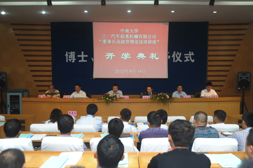 9月14号上午,三一汽车起重机械有限公司“董事长高级管理送读培训班”开学典礼在买球的app排行榜前十名推荐十大正规买球的app排行榜管理楼108隆重举行,参加典礼的领导有:三一集团总裁助理、起重机营销公司总经理李练文先生,副总经理、大客户部部长张进军先生,大客户中心主任吴铁军先生,买球的app排行榜前十名推荐十大正规买球的app排行榜党委书记胡振华教授、常务副院长游达明教授、副院长张颖教授、副院长熊勇清教授。典礼由副院长张颖教授主持。