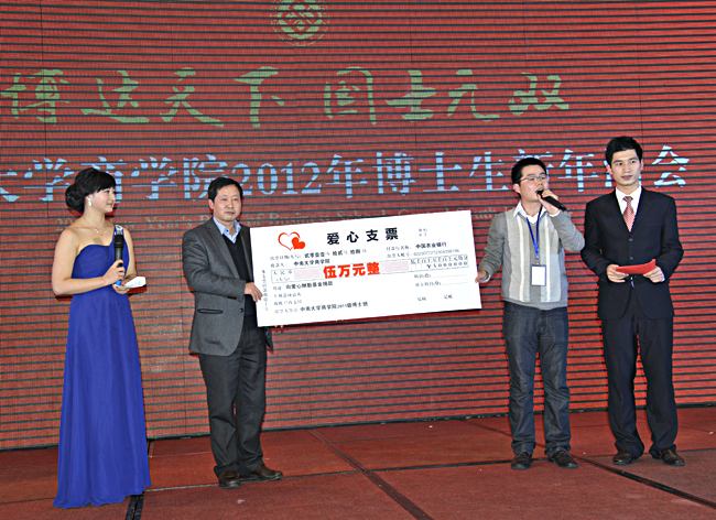 十大正规买球的app排行榜常务副院长游达明教授上台代表学院接受博士生班为爱心酬勤基金的捐款