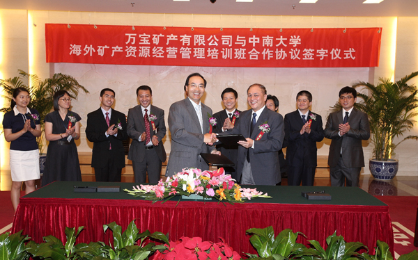 中国北方工业公司党委书记、万宝矿产有限公司董事长植玉林对黄健柏教授一行的来访表示热烈欢迎,并简要介绍了公司产业概况与研发情况。他指出,在过去几年,万宝矿产与我校在选矿、冶金人才的培养和输送等领域开展了卓有成效的合作,万宝矿产对人才、高新技术、管理咨询等方面有着强劲的需求,校企之间有很好的合作基础与契合点。植玉林董事长表示,希望北方公司与我校建立更高层次和更广泛的战略合作关系,实现合作共赢、共同发展的目标。 常务副校长黄健柏教授对万宝矿产有限公司的热情接待表示感谢。他说,买球的app排行榜前十名推荐是一所以有色金属资源开采和加工、轨道交通、生物医学等学科为特色的综合性大学,目前,我校正努力朝建设国内一流、世界知名的高水平研究型大学目标迈进。学校在人才培养、科学研究与社会服务等方面需要不断创新,与包括万宝矿产在内的企业全面开展合作必定能提升双方核心竞争力。黄副校长希望双方进一步加强交流,建立产学研合作的长效机制,共谋发展。 会上,黄健柏常务副校长与植玉林董事长共同签署了《万宝矿产有限公司 买球的app排行榜前十名推荐十大正规买球的app排行榜 海外矿产资源经营管理培训班协议书》。根据协议,双方将在海外矿产经营管理人才方面进行合作。另外,双方还就校企全面战略合作进行了有益的探讨。 十大正规买球的app排行榜党委书记胡振华教授、十大正规买球的app排行榜副院长张颖教授、资源生物学院陈玉如副书记等参加了签字仪式。