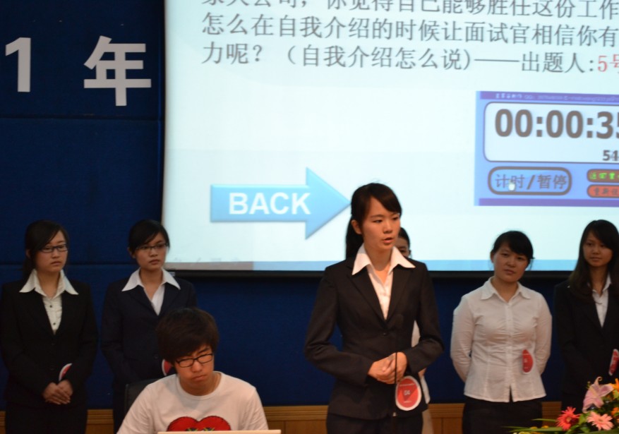 比赛为淘汰制,分为上下两个半场。上半场有三个环节:第一环节为自我介绍,参赛选手需要在一分钟内向大家“推销”自己,9名选手各显其能,或沉着自信,或率直活泼,展示着自身独具的特色;在“我是面试官”环节中,选手随机抽取预设问题并作答,主要考验选手们的组织表达能力、分析能力和处理人际关系的技巧;第三环节——“情景模拟”,评委通过此环节进一步了解选手,观察其在自信心、责任感、应变能力及合作精神等方面的特点与风格。随后,评委就各位选手在上半场的表现给予了点评,指出由于缺乏应聘经历,没接受过职场礼仪的相关培训,大家在表现上仍有待提升。同时,面试官们对每位同学的表现分别点评并提出了中肯的意见。