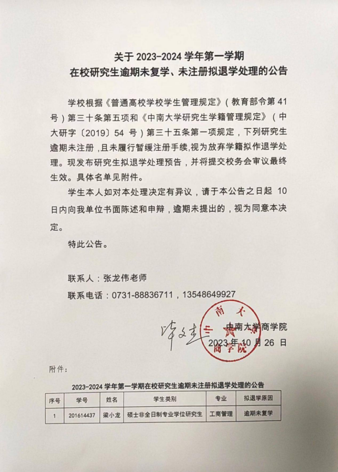 关于2023-2024学年第一学期在校研究生逾期未复学、未注册拟退学处理的公告(MBA)