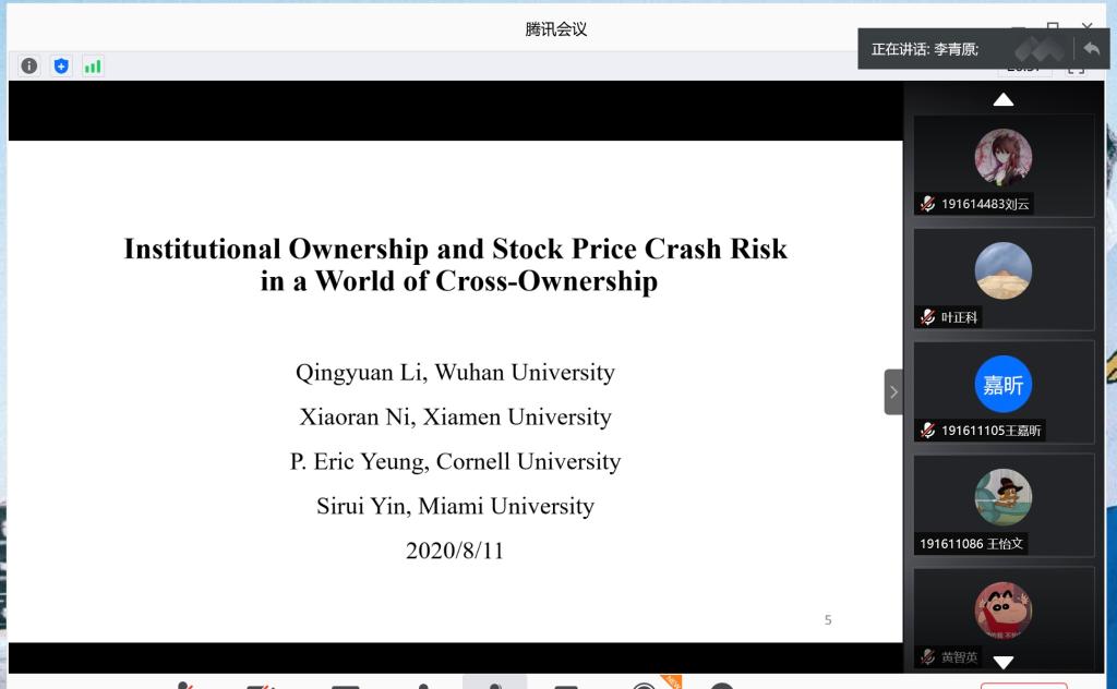 讲座伊始,李教授从目前财务会计研究的一些背景选题,提出论文写作要学会将新旧背景、经典选题、不同学科进行交叉,并且每天要追踪最新期刊文献、了解学术研究动态前沿以启发新的选题。而后,李教授介绍了关于交叉持股、股价崩盘风险相关研究,引入自身正在写作的论文 “Institutional Ownership and Stock Price Crash Risk in a World of Cross-Ownership”。接着,李教授从选题的动机、文献回顾、研究结果和贡献以及数据分析等几个方面对该篇论文进行了详细的解说。该篇论文新颖的角度、严谨的分析过程、详实的数据资料使在座老师同学对论文写作产生了新的思考。