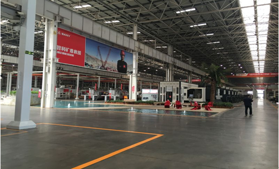 9:10左右,解说员带领大家一起参观了三一集团的泵送车装配车间。在车间,我们看到了在宽敞明亮的车间参观通道两旁随处可见的公司企业文化标语、还有通道一侧的播放屏也一直不断地滚动播放着企业的宣传片和重大活动事件。整个车间给人以耳目一新的即视感:规范的操作流程、整洁的现场布置、到位的看板管理、物流人行通道、操作区、物料区合理分区等各方面细节都显得有条不紊。另外,泵送车车间与数控车间之间的喷泉、水池、休闲椅等设施让人眼前一亮,员工仿若置身“花园式”工厂,让人流连忘返。